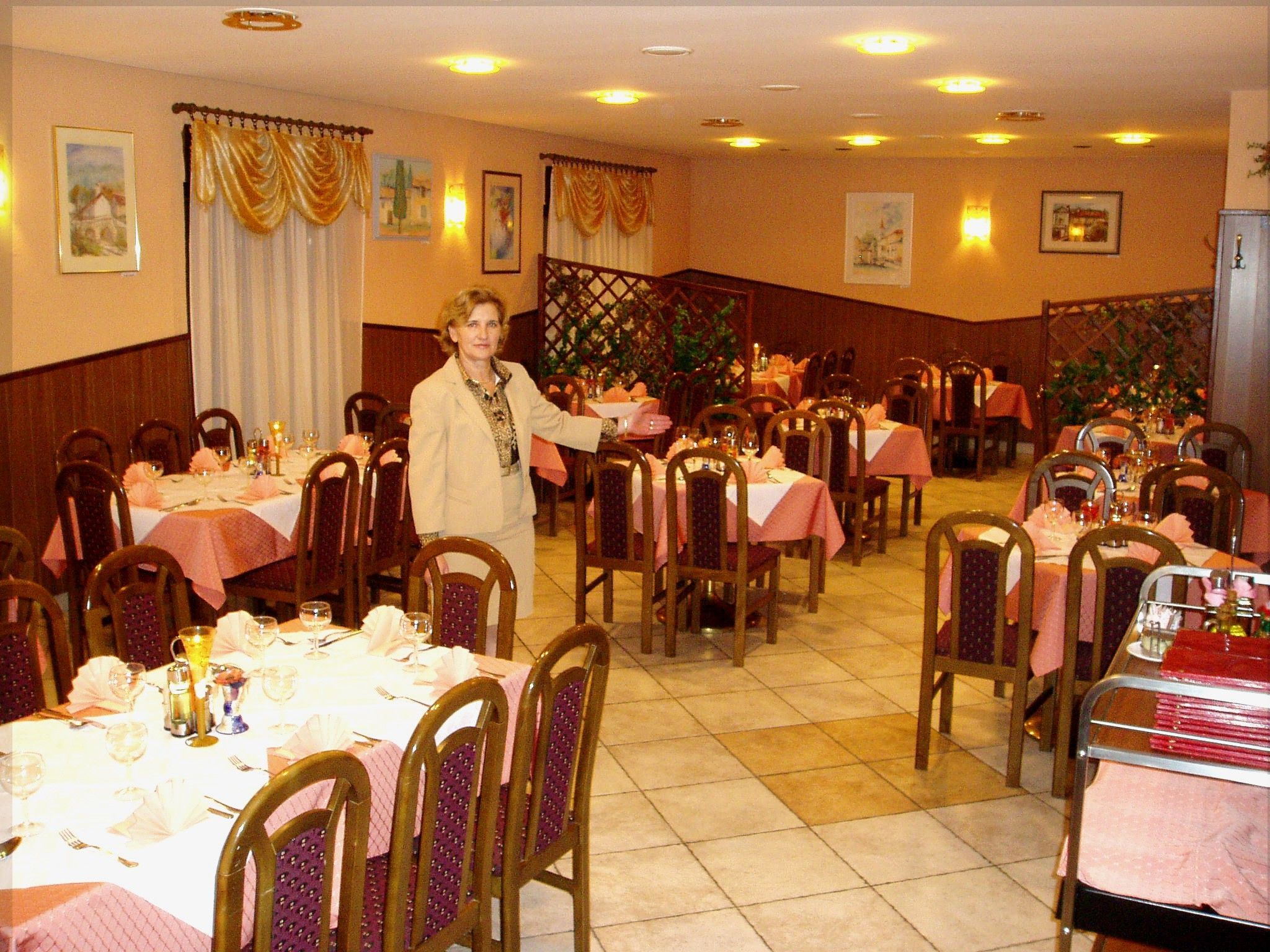 Vsak dan goste razvaja z mesnimi in morskimi specialitetami, široko ponudbo menijev ter ustrežljivostjo in z občutkom za hrano. Toplo priporočamo, da poskusite njeno domačo jurčkovo juho v kruhovi skodelici, pršut v teranovi omaki z njoki, zrezek po sadjarsko ali ribe in jedi z žara.